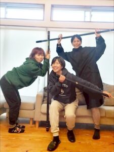 Kunico先生の笑いヨガ、呼吸からスタート。皆さん「あっはっはー!」と笑顔に。Rioca先生は立位で首肩まわりのほぐしと、なんとヨガ棒で行進!股関節も動きやすくなり、身体もあたたまりました。