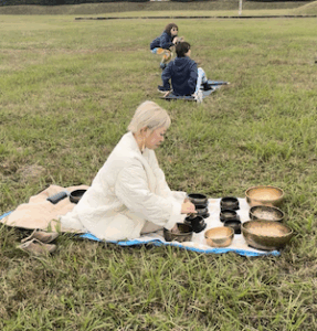 まりさんのシンギングボウルの音色が奈良の大空に響く空間は格別。ヨガのあとには、希望される方にお腹に当てて鳴らすセラピーもしてくださいました。